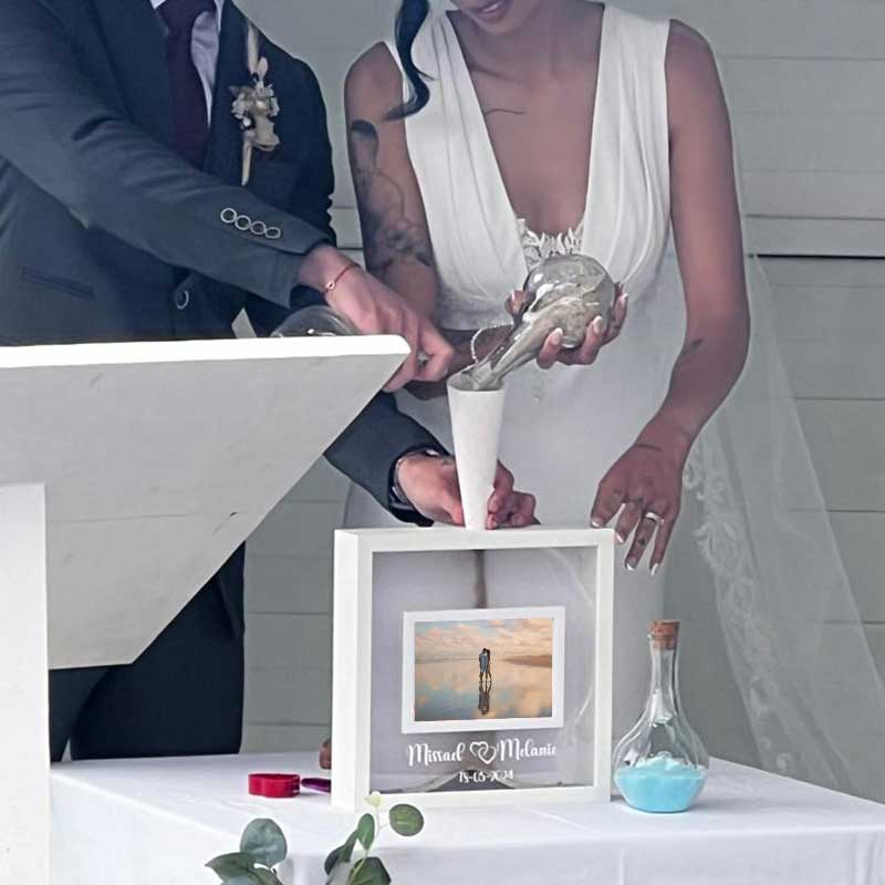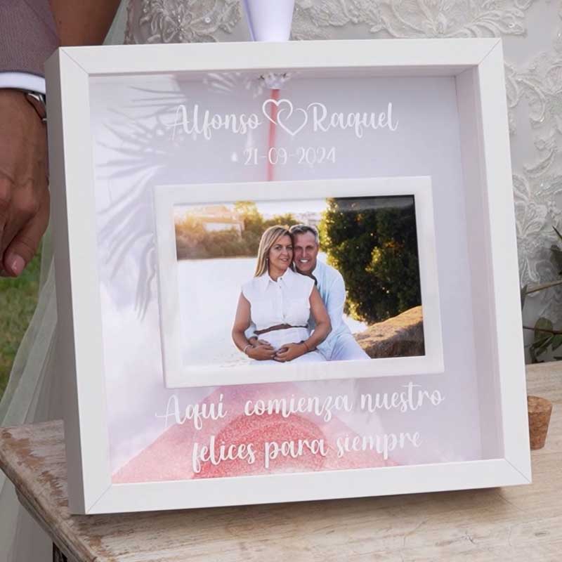 Este marco para la ceremonia de la arena contiene un marco de fotos exterior, para que cambies la foto todas las veces que quieras. Además puedes personalizarlo con la fecha o el nombre de la pareja para que cuando la arena caiga, lo haga en el lugar justo para que se vean bien los nombres. Lo hemos sellado por detrás para que no se salga la arena y además te adjuntamos un cono para que una vez realice la ceremonia, no estropear la decoración del altar.