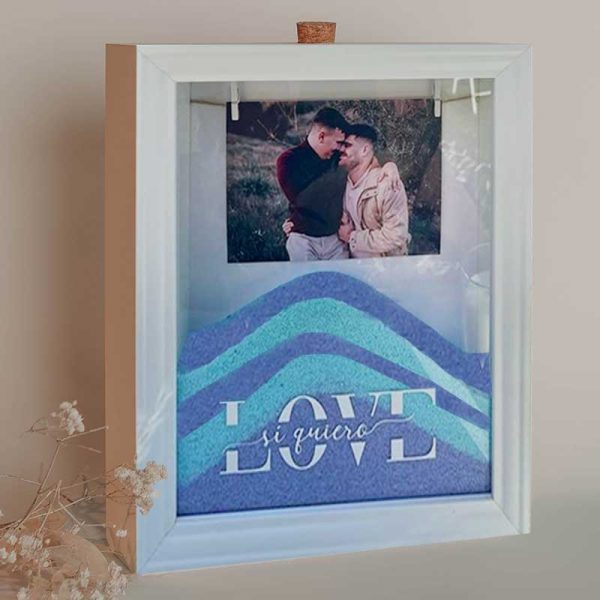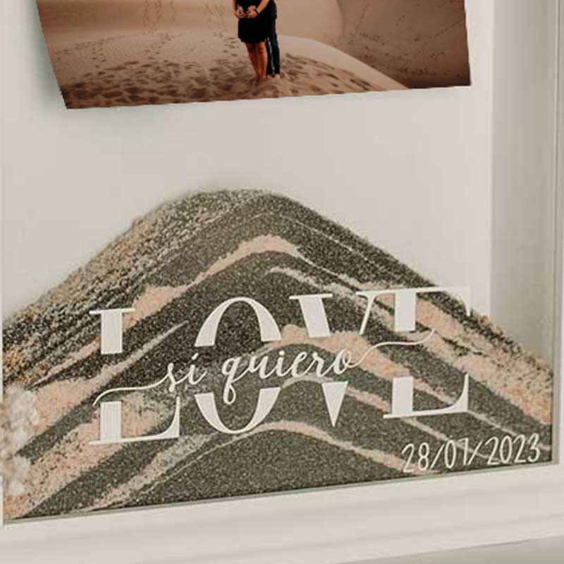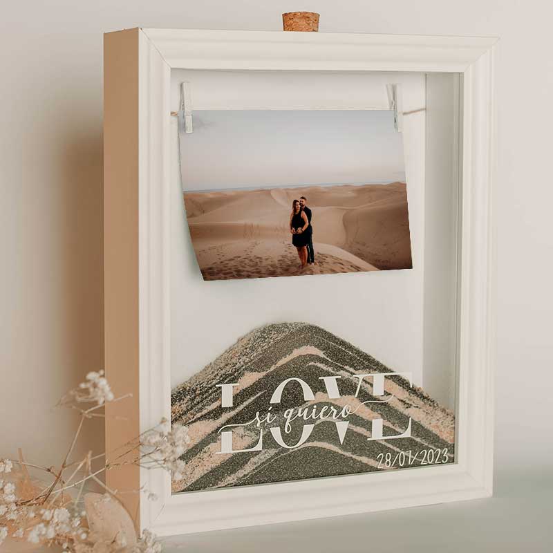 El ritual de la arena es uno de los rituales más conocido y queridos por las parejas por eso y porque después de más de 100 bodas sabemos qué funciona, hemos creado este pack del ritual de la arena para ti. La ceremonia de la arena simboliza la unión entre ambos, y les convierte, simbólicamente, en un vínculo inquebrantable e inseparable. Este marco no es 100% personalizado ya que no incluimos tu nombre o fecha de la boda, pero sí incluimos una foto vuestra. Este será la representación perfecta de vuestro «sí quiero». Mira qué bonito queda.
