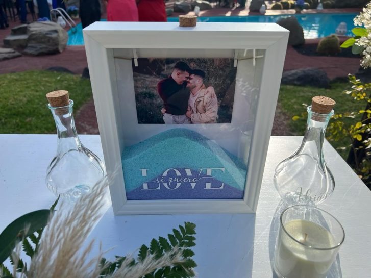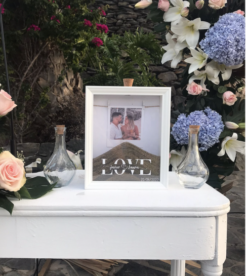 2. Un bote o marco donde echar la arena. ¡Ojo! Porque no te vale cualquier marco. Yo te recomiendo que si usas un marco tenga algunas cosas características para asegurarte de que el ritual quede bien y no te llene todo de arena. ¡Créeme! Después de haber hecho este ritual muchas veces, sé qué puede salir mal. Por eso he creado un kit del ritual de la arena con todo lo aprendido oficiando bodas.